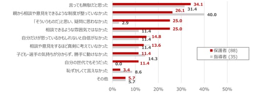 保護者・指導者ともに意見や要望を伝えたことがある人は多かったものの、伝えたことがない人の理由としては「言っても無駄だと思った」の割合が高く、当事者を含む、世代や立場を超えた様々な人がフラットに意見を伝え合える環境の必要性が示唆されました。