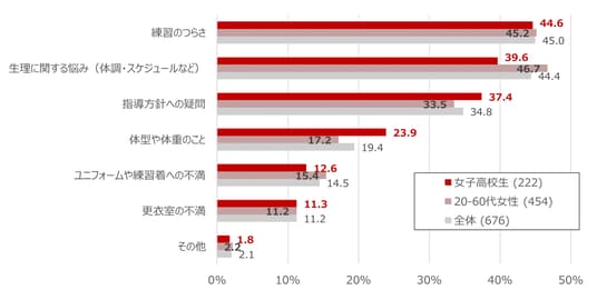 (13.7%)、「生理等によるユニフォームや見た目への影響」(7.2%)も挙げられ、女性特有の悩みがスポーツの継続意欲に影響を与えていることがうかがえます。