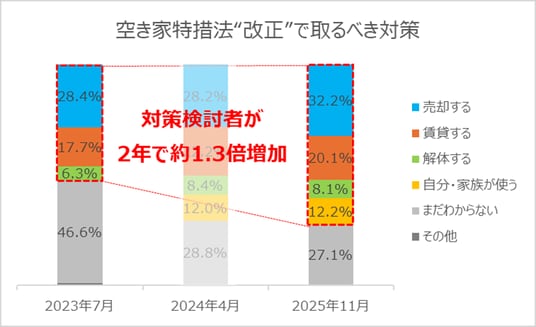 2023年12月に改正された空き家特措法により、取るべき対策として最も多いのは「売却(32.2%)」で3人に1人の割合で選択しています。次いで多いのは「まだわからない(28.8%)」という対策未検討層ですが、2年で空き家対策の検討層が1.3倍増加しています。
