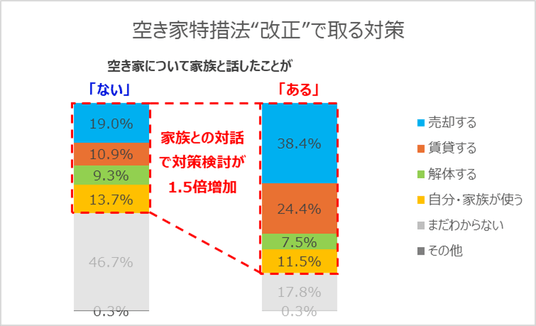 家族との対話の有無別にクロス集計した、空き家特措法改正で今後3年以内に取るべき対策について