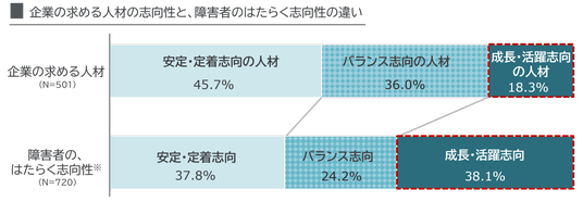 企業が障害者人材に求める志向を調査したところ、最も高かったのは「安定・定着志向」で45.1%。一方、「成長・活躍志向」を持つ人材を求める割合は18.2%にとどまりました。