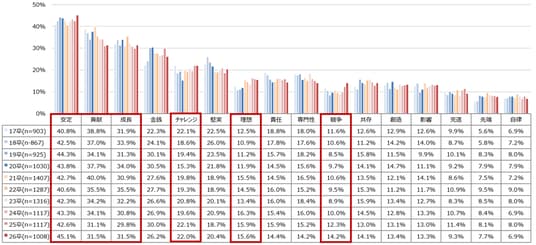 ・また、過去数年「チャレンジ」「理想」「競争」といったアグレッシブな要素の選択率が上昇する傾向もみられる。