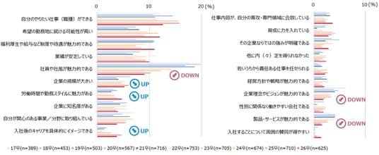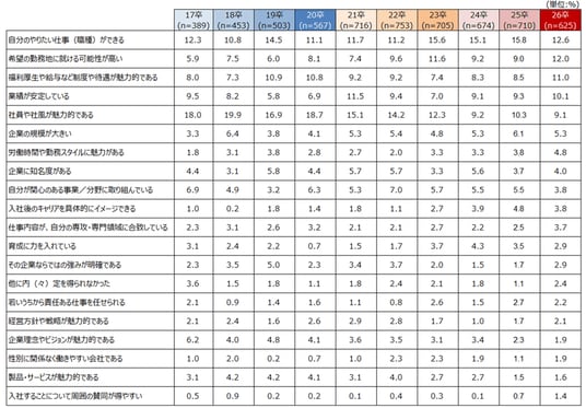 ・「勤務地」「福利厚生」「業績の安定性」など働く環境・条件に関する項目の選択率が伸びた結果、昨年まで2位の「社員や社風が魅力的」は5位となった。