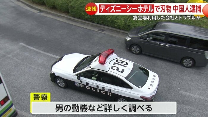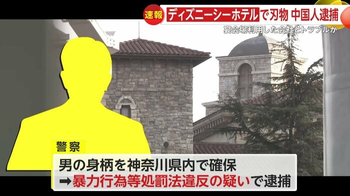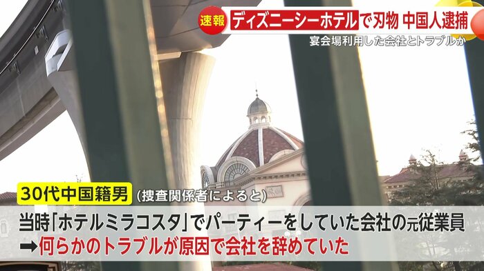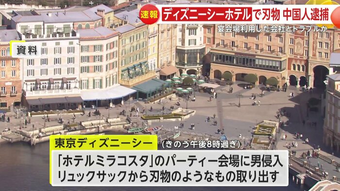東京ディズニーシーのホテルの宴会場に男が刃物のようなものを持って侵入し逃走した事件で、警察は30代の中国籍の男を逮捕した。男は当時「ホテルミラコスタ」のパーティー会場を利用していた会社の元従業員で、何らかのトラブルがあり会社を辞めていたという。