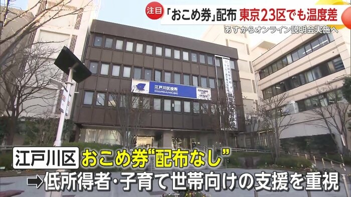 その一方で、おこめ券を“配らない”と決めたのは江戸川区。区によると、おこめ券よりも、低所得者や子育て世帯向けの支援を重視していくためだという。