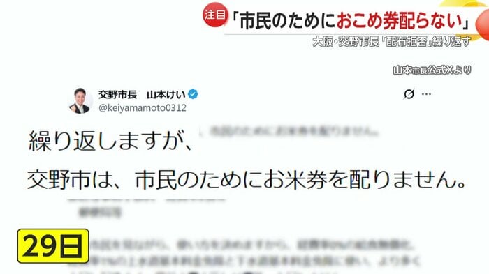 一方、大阪・交野市の山本市長は、おこめ券の“配布拒否”を繰り返している。