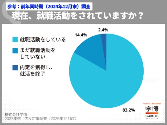 株式会社学情(本社:東京都中央区)は、2027年3月卒業(修了)予定の大学生・大学院生を対象に、最新の「内々定の獲得状況」についてインターネットアンケートを実施しました。