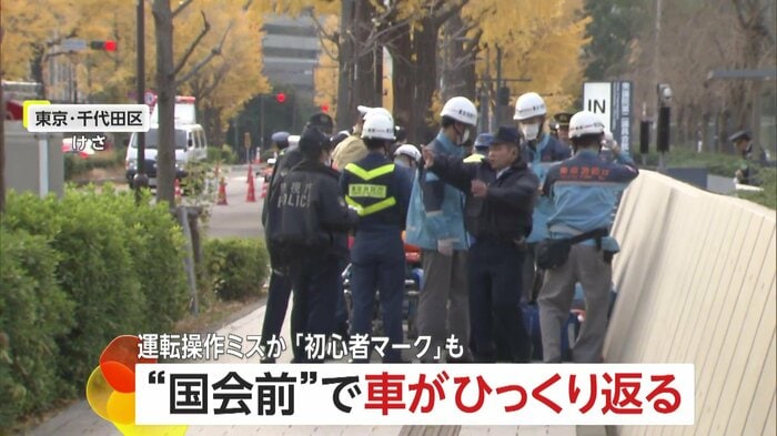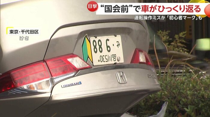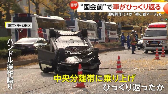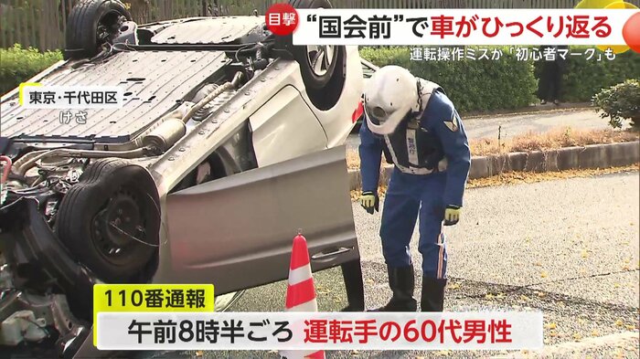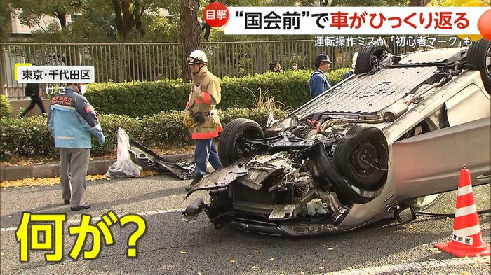 国会議事堂の目の前で2日、初心者マークをつけた乗用車がひっくり返る事故が起きた。