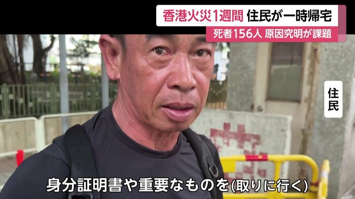 香港の高層住宅の大規模火災から1週間、住民が初めて荷物を持ち出すため一時帰宅した。