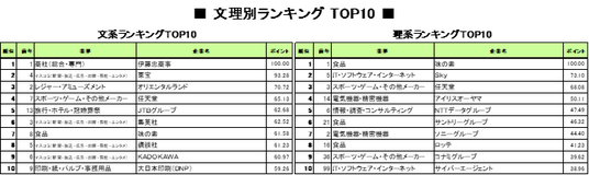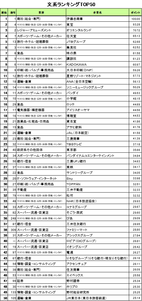 (1)文系1位は伊藤忠商事。トップ10に娯楽関連企業ずらり。「マスコミ」がトップ50の15社占める