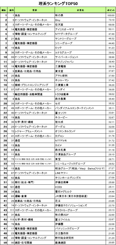 (2)理系1位は味の素。「食品」がトップ50の15社占める。2位Sky、3位任天堂…IT・ゲームも人気