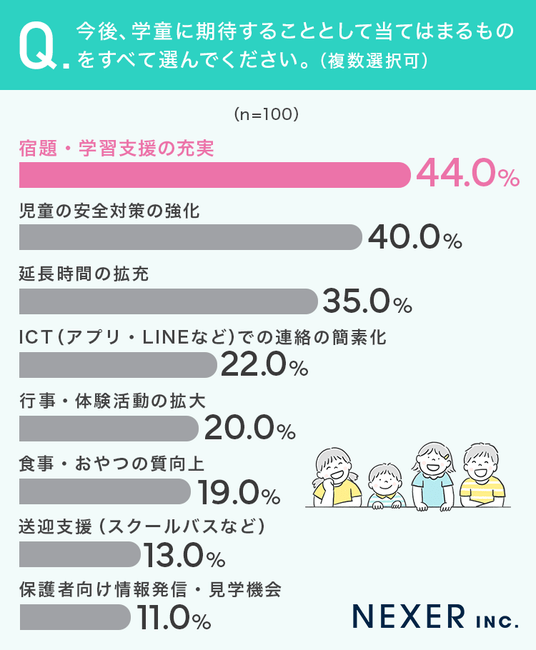 今後学童に期待することとして、もっとも多かったのは「宿題・学習支援の充実」で44%の方が回答していました。