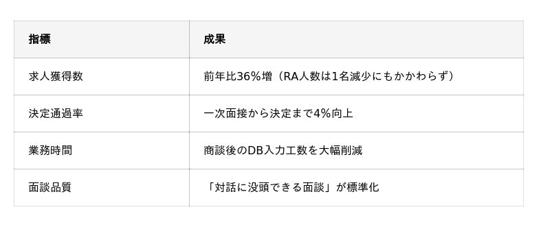 RAの時間配分を「入力業務」から「高粗利案件へのアクション」に振り向けることで、同じ、あるいは少ない人数でも粗利を伸ばせる体制が構築されました。