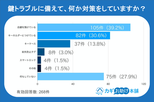 当社の運営する鍵トラブル専門のサービス「カギお助け本舗」では、鍵をなくした経験のある全国の18歳以上の男女268名を対象に、「鍵の紛失とその後の対策に関する実態調査」を実施しました。