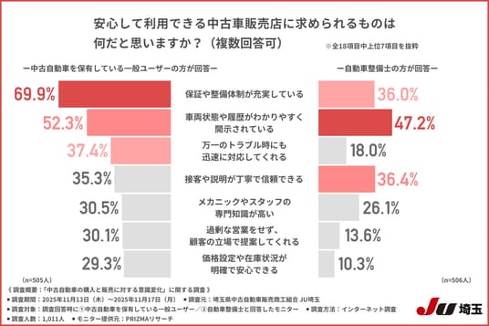 一般ユーザーは「保証や整備体制」「透明な情報開示」「トラブル時の対応」を求め、自動車整備士は「透明な情報開示」「丁寧な説明」「保証や整備体制」を重視しており、双方に共通するキーワードは“透明性”と“信頼性”です。