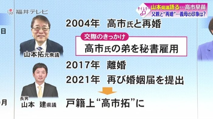 山本さんの父親で元衆議院議員の拓さんは、2004年に高市さんと再婚。その後、2017年に一度離婚したが、2021年に再び婚姻届を提出している。