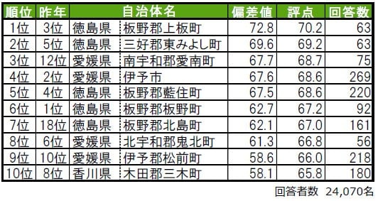 1位は徳島県板野郡上板町で、唯一偏差値70台の高い評価を得ています。2位は昨年5位から順位を上げた徳島県三好郡東みよし町です。3位は愛媛県南宇和郡愛南町で、昨年12位から大きく順位を上げました。トップ10のうち9つが徳島県・愛媛県・香川県の各郡部に属する「町」で、そのうち4自治体が徳島県板野郡に属しています。