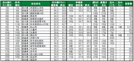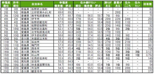 街の幸福度は、1位徳島県板野郡上板町、2位徳島県三好郡東みよし町、3位愛媛県南宇和郡愛南町。