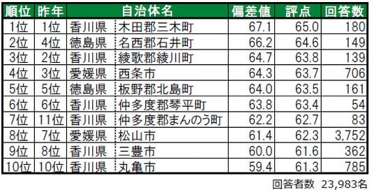 香川県木田郡三木町が、2年連続で1位に輝きました。2位は、昨年4位から順位を上げた徳島県名西郡石井町、3位は香川県綾歌郡綾川町です。トップ10のうち6自治体が、香川県・徳島県の各郡部に属する「町」となっています。