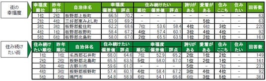 街の幸福度は、1位板野郡上板町、2位三好郡東みよし町。3位は2年連続で板野郡藍住町。