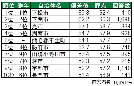 下松市が、3年連続で1位に輝きました。下松市は、「住みここち」を含む4つのランキングで1位の高い評価を得ている街です。2位も、3年連続で下関市です。3位は光市で、昨年4位から一つを順位を上げました。トップ10内では、昨年は偏差値50未満のため順位非公開だった熊毛郡平生町(くまげぐん ひらおちょう)が、今年は5位にランクイン、トップ10内で唯一郡部に属する「町」です。