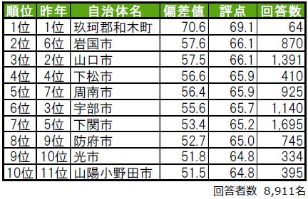 玖珂郡和木町が、唯一偏差値70台の高い評価を得て、3年連続で1位に輝きました。玖珂郡和木町は、トップ10内で唯一郡部に属する「町」です。2位は、昨年6位から順位を上げた岩国市です。3位は、山口市という結果になっています。