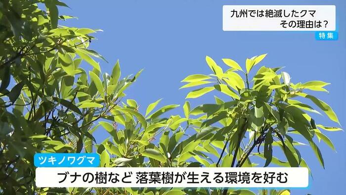 全国各地で目撃されているツキノワグマはドングリを餌とするため、ブナなど落葉樹が生える環境を好む。しかし、九州は照葉樹が多く、クマが好む環境が少ないため絶滅したのではないかと西田教授は分析する。