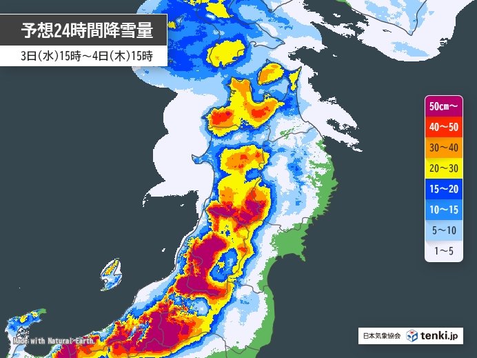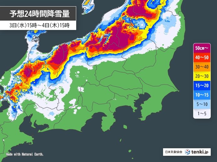 東北地方や関東甲信、北陸、東海などの山沿いを中心に3日夜から4日朝にかけて大雪のおそれがある。