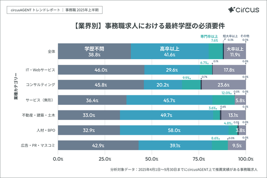 業界別に見ると、IT・Webサービス業界(学歴不問:46.0%)やコンサルティング業界(学歴不問:45.8%)で学歴不問の比率が高く、スキルや適性を重視する実力主義の傾向が推察されます。一方で、人材・BPO業界(高卒以上:58.0%)や不動産・建築・土木業界(高卒以上:49.7%)では、「高卒以上」を求める割合が高くなっています。