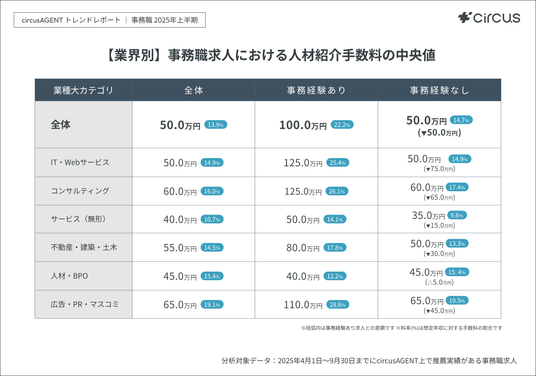 事務職全体の紹介手数料中央値(金額)は50.0万円、料率は13.9%となりました。業界別では、広告・PR・マスコミ業界(19.1%)やコンサルティング業界(16.0%)が比較的高いものの、全体的にコストは抑えられている傾向にあります。