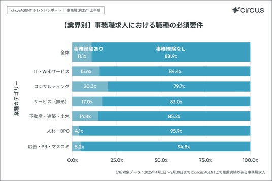コンサルティング業界(経験者のみ:20.3%)やサービス業界(経験者のみ:17.0%)では、他業界と比較して経験者向けの求人割合がやや高い傾向が見られました。ここでは、単なる事務処理だけでなく、数値管理経験やマルチタスクスキルといった、より高度な実務能力が求められるケースがあります。