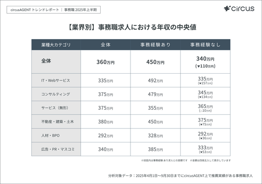 事務職全体の想定年収中央値は360万円であり、経験者向けは450万円、未経験者向けは340万円となりました。