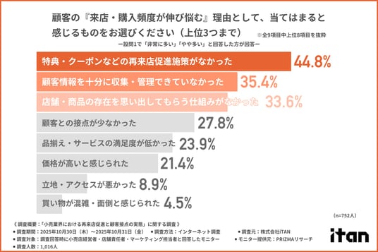 「顧客の『来店・購入頻度が伸び悩む』理由として、当てはまると感じるもの」について尋ねたところ、『特典・クーポンなどの再来店促進施策がなかった(44.8%)』が最も多く、『顧客情報を十分に収集・管理できていなかった(35.4%)』『店舗・商品の存在を思い出してもらう仕組みがなかった(リマインド不足)(33.6%)』となりました。