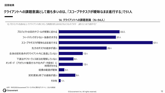 「スコープやタスクが曖昧なまま進行する」が51人と最多で、フリーコンサルが直面する最大の課題となっています。