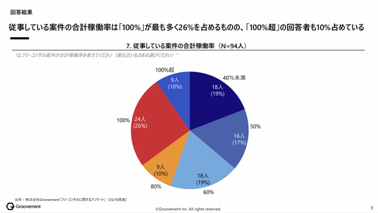 フリーコンサル案件の合計稼働率については、「100%」が最も多く26%でした。