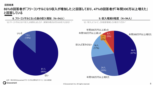 - また、86%が収入増を実感しており、そのうち73%が「年間100万円以上増えた」と回答するなど、キャリアの質と経済的なメリットを両立しています。