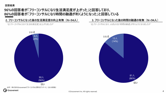 フリーコンサルとしての働き方に関する調査において、「生活の満足度が上がった」と回答した人は96%に達し、前回調査(2025年2月実施)と比較して4.7%増加しました。