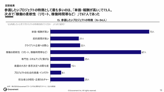 参画したいプロジェクトの特徴として、「単価・報酬が高い」73人、「稼働の柔軟性」67人と「報酬」と「柔軟性」が多く上げられました。