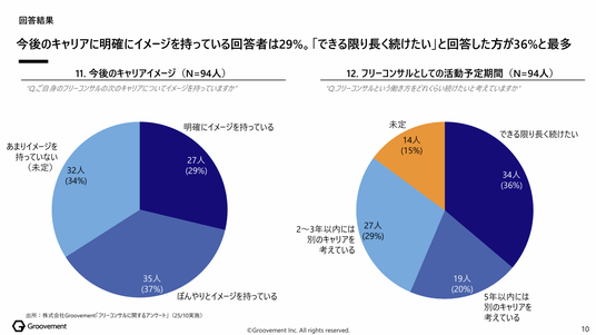活動予定期間については、「できる限り長く続けたい」が36%と最も多く、フリーコンサルという働き方に高い満足度を持ち、長期的なキャリアとして捉えている方が多いことが示されています。