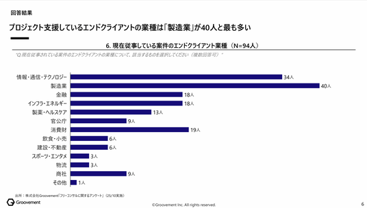 現在従事されている案件のエンドクライアントの業種について複数回答可能なアンケートを行ったところ、「製造業」が最も多く40人でした。