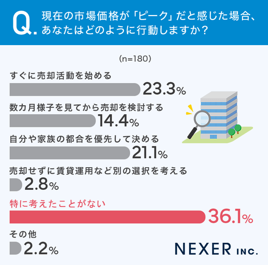 市場価格が「ピーク」だと感じても、「特に考えたことがない」という回答が 36.1% で最も多く、多くの方が市場の機会を深く検討していないことが分かりました。