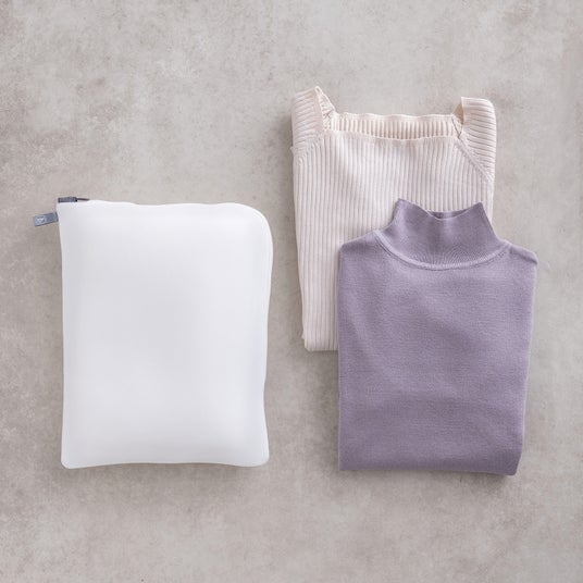 厚さ約3mmの立体メッシュ生地「無蛍光マシュマロメッシュ」を使用しているので、洗濯時の衝撃を吸収し、糸くずの侵入を抑えながらやさしく洗うことができます。たたんだニットにフィットする立体的なボックス型で、2着を区切れるセパレートシートがネット内の衣類同士の絡みや摩擦を抑えます。