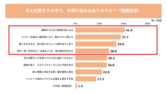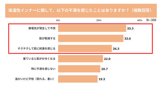 冬の寒さに対する冷え対策は多くの女性にとって必須となっている一方で、暖房による乾燥や寒さ対策アイテムに不快感がある女性が半数以上にのぼることが明らかになりました。中でも、保温性インナーに関しては「静電気が発生して不快」や「チクチクして肌に刺激を感じる」と回答する人が多く、冷え対策を行いながらも別のストレスが発生してしまう状況が浮き彫りとなっています。