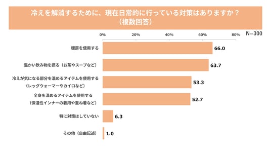 調査結果によると、9割以上の女性が日常的に冷え対策を実施しており、最も多い対策として「暖房を使用する(66.0%)」が挙げられました。その次に多かったのは、「温かい飲み物を摂る(63.7%)、「冷えが気になる部分を温めるアイテムを使用する(53.3%)」、「全身を温めるアイテムを使用する(52.7%)」という対策でした。これらの対策は、冷えを軽減するために欠かせない手段として多くの女性に取り入れられており、寒暖差の激しい季節でも快適に過ごすための重要な方法となっています。