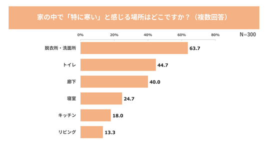 自宅の中で特に寒いと感じる場所は、「脱衣所・洗面所」「廊下」「トイレ」が上位となり、