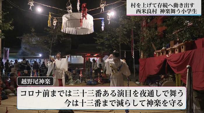 新型コロナウイルス感染症流行前までは三十三番ある演目を夜通しで舞っていたが、年々舞手が減少し、現在は十三番まで減らして神楽を守っている。