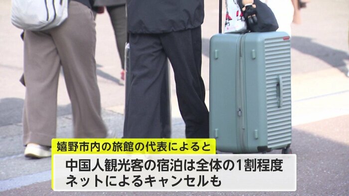 嬉野市内の旅館の代表によると、中国人観光客の宿泊は全体の1割程度だが、ネットによるキャンセルも出ているという。