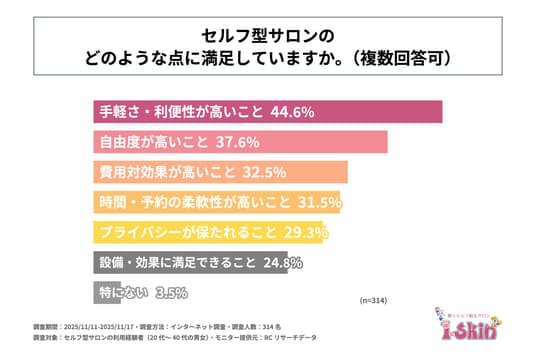 セルフ型サロンの利用経験者が、有人サロンではなくセルフ型サロンを選ぶ主な理由は「利用が手軽で気軽なため」や「料金が安いため」!i-Skin合同会社が「セルフ型サロンの利用実態に関する調査」を実施!