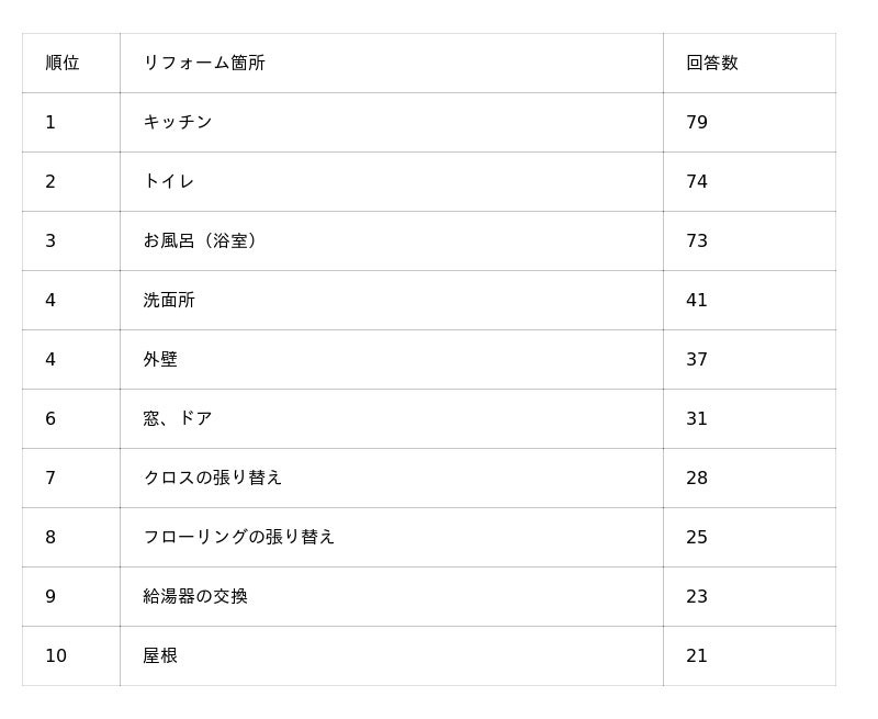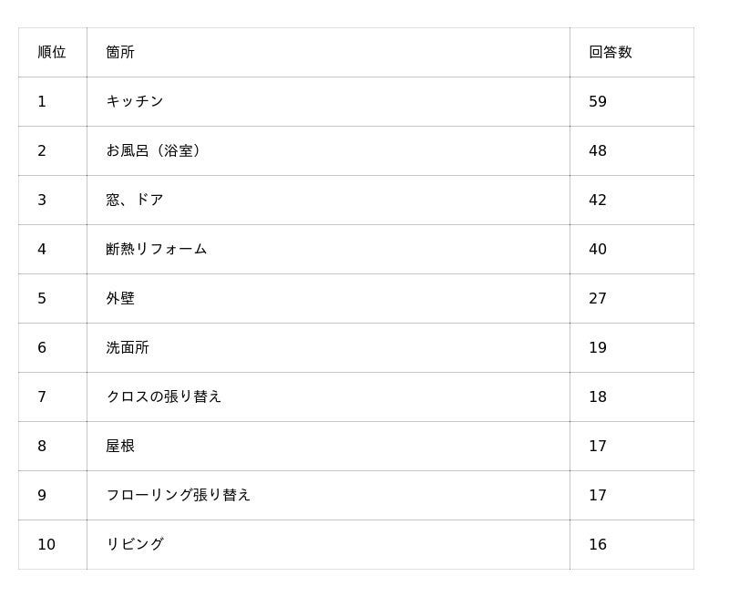 2025年に最もリフォームされた場所ランキング(複数回答)