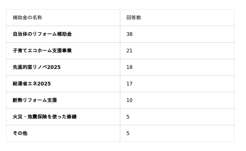 最も多いのは 「自治体補助金」。窓リノベ/給湯省エネなど 国の省エネ系補助金の利用も目立つ結果となりました。